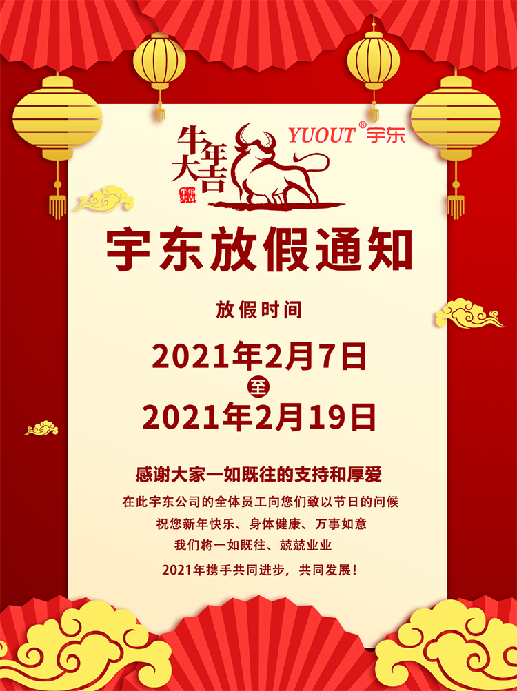 一年一度的農歷春節(jié)已經(jīng)近在眼前,感謝大家對宇東公司的支持與厚愛,在此先預祝您新年快樂、身體健康、財源廣進!