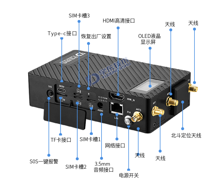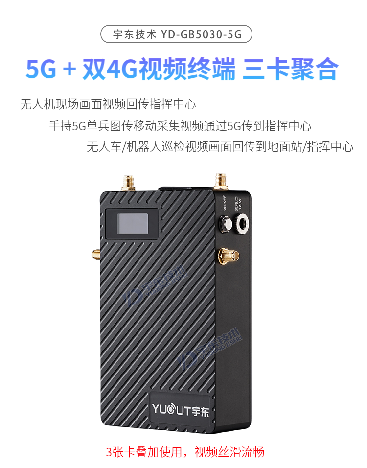 YD-GB5030-5G單兵圖傳,具備三個(gè)SIM卡槽,同時(shí)支持一個(gè)5G網(wǎng)絡(luò)和兩個(gè)4G網(wǎng)絡(luò), 5G便攜式多卡高清視頻終端采用嵌入式系統(tǒng)架構(gòu),采用高性能H.265編解碼處理器設(shè)計(jì)。設(shè)備支持視頻采集、編碼壓縮、傳輸、雙向?qū)χv功能。