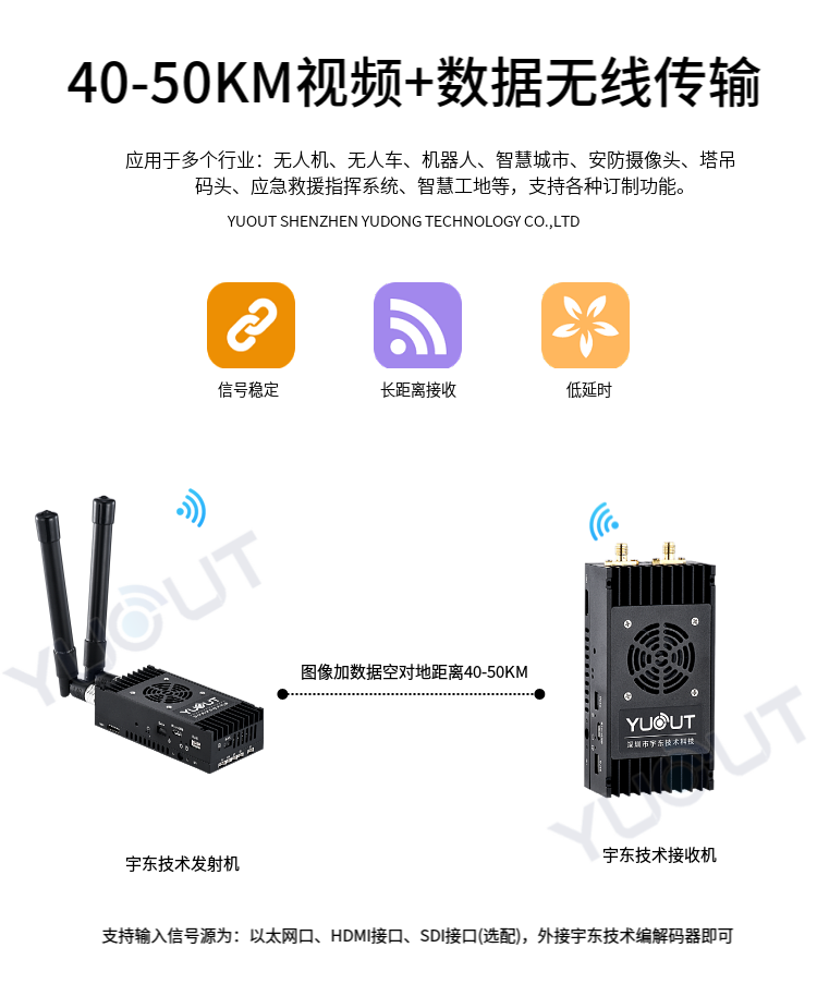 YD-TS0050-WK 是應用于無人機行業(yè)的圖數(shù)控一體化超遠距離無線傳輸設備(最遠可達 40至50 公里),具有體積小、功耗低、通信距離遠等特點,支持高清視頻、飛控數(shù)據(jù)、云臺控制數(shù)據(jù)、遙控器控制數(shù)據(jù)等同時傳輸。