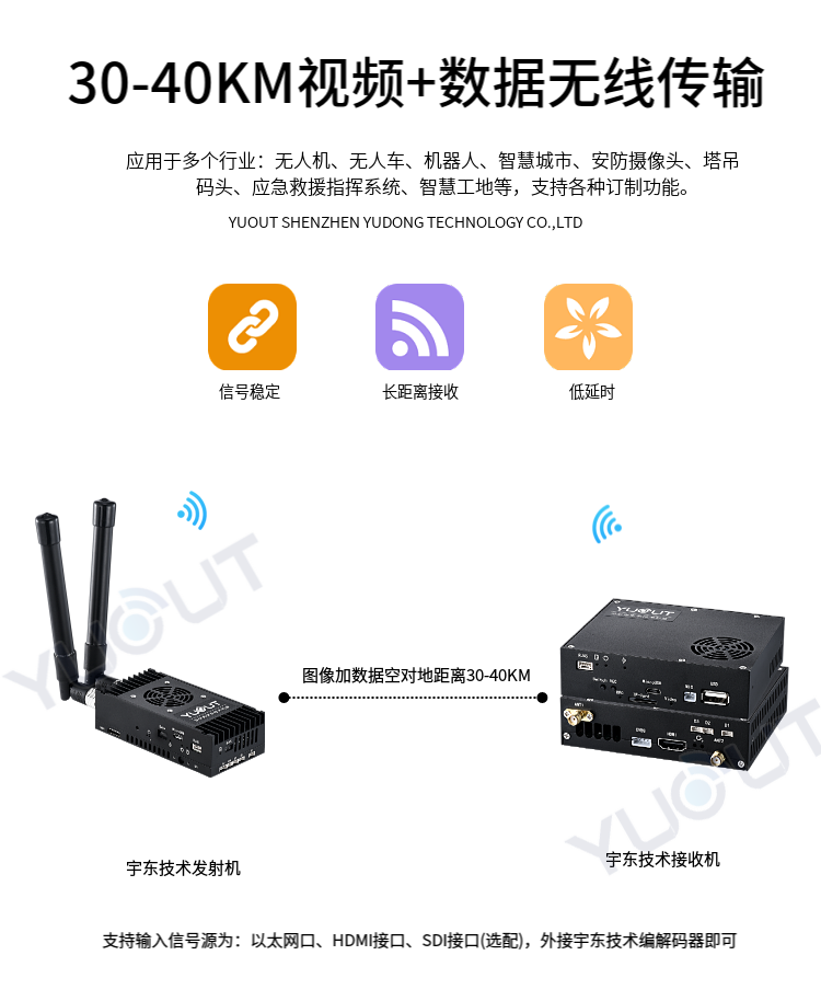 YD-TS0030-WK  是應(yīng)用于無人機(jī)行業(yè)的圖數(shù)控一體化超遠(yuǎn)距離無線傳輸設(shè)備(最遠(yuǎn)可達(dá) 30至40 公里),具有體積小、功耗低、通信距離遠(yuǎn)等特點(diǎn),支持高清視頻、飛控?cái)?shù)據(jù)、云臺控制數(shù)據(jù)、遙控器控制數(shù)據(jù)等同時(shí)傳輸。