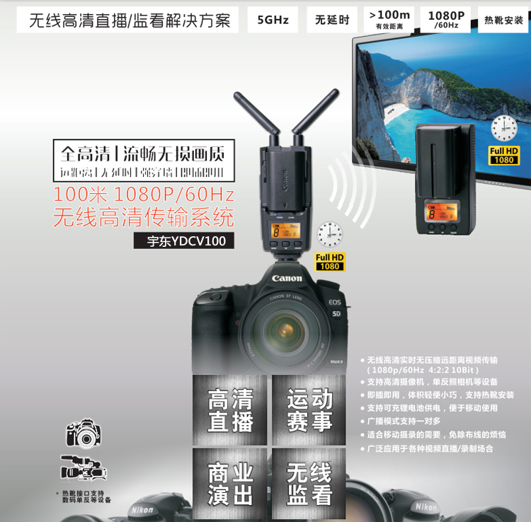 YUOUT CB8833+CB3812 is WHDI 1080p 5GHz 100m Wireless HDMI Sender Receiver System, As the widely use of HD video device, there is some problem existed in the process of cable wiring,such as the high cost and short-life usage of the cable. Also, the cable trod by the crowd under insufficient site protection is the major cause of cable performance, even lead to the live broadcast accident. YUOUT provides you with more convenient and safer solution for live broadcasting. The long distance multi-frequency transmission system applied with the high-capacity Li-battery, plug-andplay setting, can fully meet requirement of outdoor and indoor shooting. Especially, no cable wiring will bring the safer and more professional experience to you!