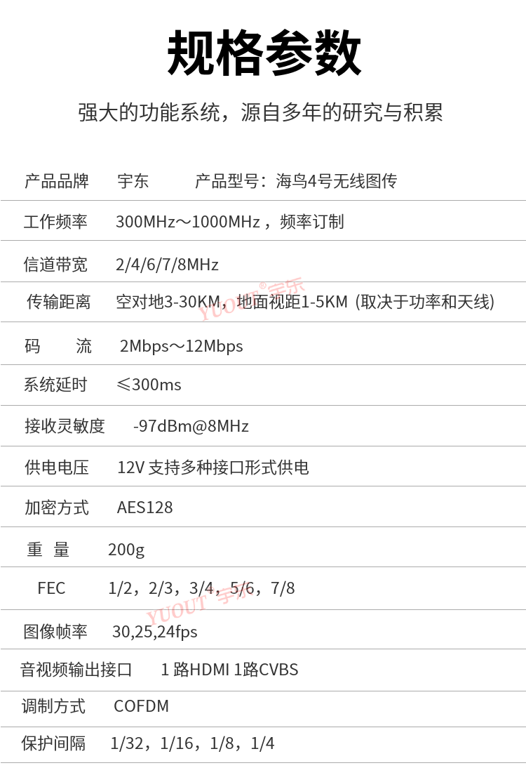 宇東海鳥4號無線圖傳高清微型無線視頻傳輸系統(tǒng),采用Coded Orthogonal Frequency Division Multiplexing:編碼正交頻分復用調(diào)制技術(shù),具有傳輸頻帶窄、很強的抗多徑干擾能力和抗多徑衰落能力,能夠?qū)崿F(xiàn)非視距(NLOS),高速運動情況下實時傳輸高質(zhì)量圖像。