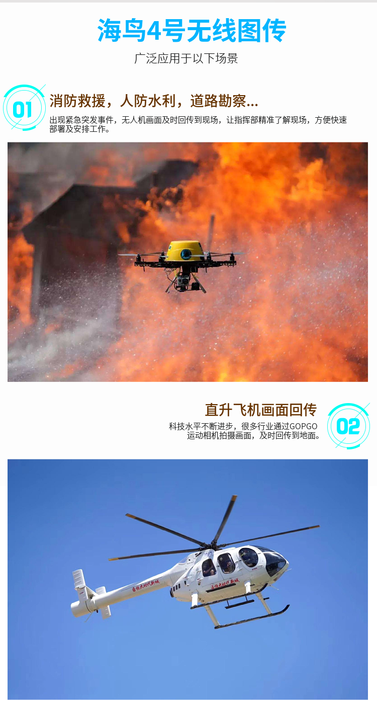 廣泛應(yīng)用于軍事偵察、邊防巡邏、公安技偵、航拍、空中測繪、電力巡查、鐵路搶險、海事執(zhí)法、城管執(zhí)法、新聞密訪、衛(wèi)生防疫等或突發(fā)事件應(yīng)急指揮、無人車、無人船、特種機器人等領(lǐng)域。設(shè)備體積小可偽裝做密訪取證、空中作業(yè)圖傳、無人機無線圖像傳輸。