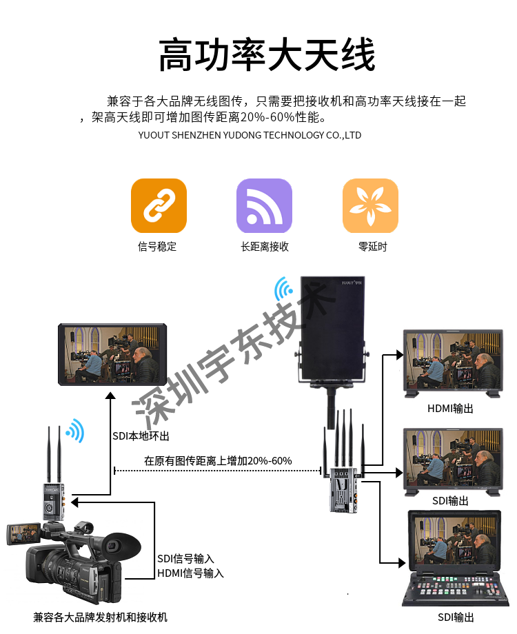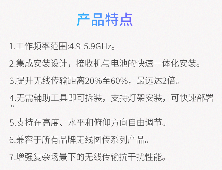 1. 工作頻率范圍:4.9-5.9GHz 2. 集成安裝設(shè)計(jì),實(shí)現(xiàn)與接收機(jī)與電池的快速一體化安裝 3. 無(wú)需輔助工具即可拆裝,支持燈架安裝,可快速部署 4. 支持在高度、水平和俯仰方向自由調(diào)節(jié), 5. 適用于所有品牌無(wú)線圖傳全系列產(chǎn)品 6. 增強(qiáng)復(fù)雜場(chǎng)景下的無(wú)線傳輸抗干擾性能 7. 提升無(wú)線傳輸距離最遠(yuǎn)達(dá)2倍