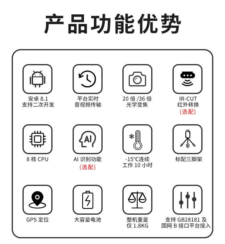4G高清AI智能布控球 * AI智能識別,更清晰·快傳輸·識強 * 輕量化,整機重量僅1.8KG * Android 8.1 8核,20倍/36倍光學(xué)變焦 * AI智能識別,可人臉識別、車輛識別、安全帽識別、工服識別、銘牌識別等等。 * 2T大容量,支持雙sim卡、雙t卡,最高2T內(nèi)存 * 在線傳輸,作業(yè)現(xiàn)場隨時看,可視化平臺調(diào)度指揮 * 電子地圖實時檢測人員、設(shè)備、事件、區(qū)域信息 * 第一時間掌握現(xiàn)場情況,遠程決策,統(tǒng)一協(xié)調(diào)?